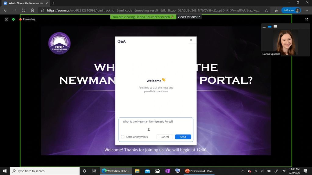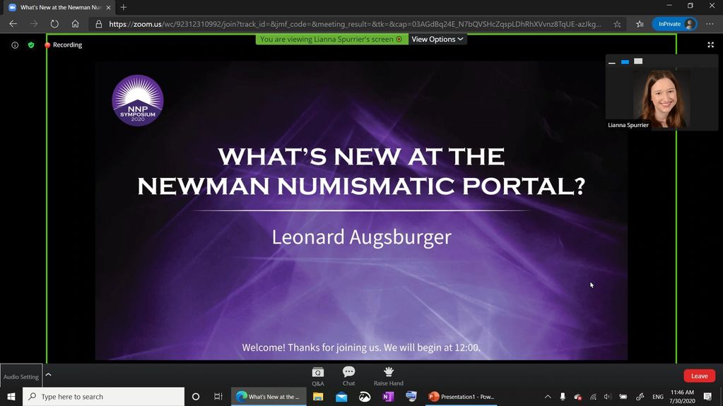 Last is the Raise Hand button, which will be used if the presenter wants to ask the audience general questions. For example, Leonard Augsburger might ask, "Raise your hand if you're familiar with the Newman Numismatic Portal." Simply click the button to raise your hand. The hand will turn green, and the presenter will get a count of how many hands are up. Click it again to lower your hand.